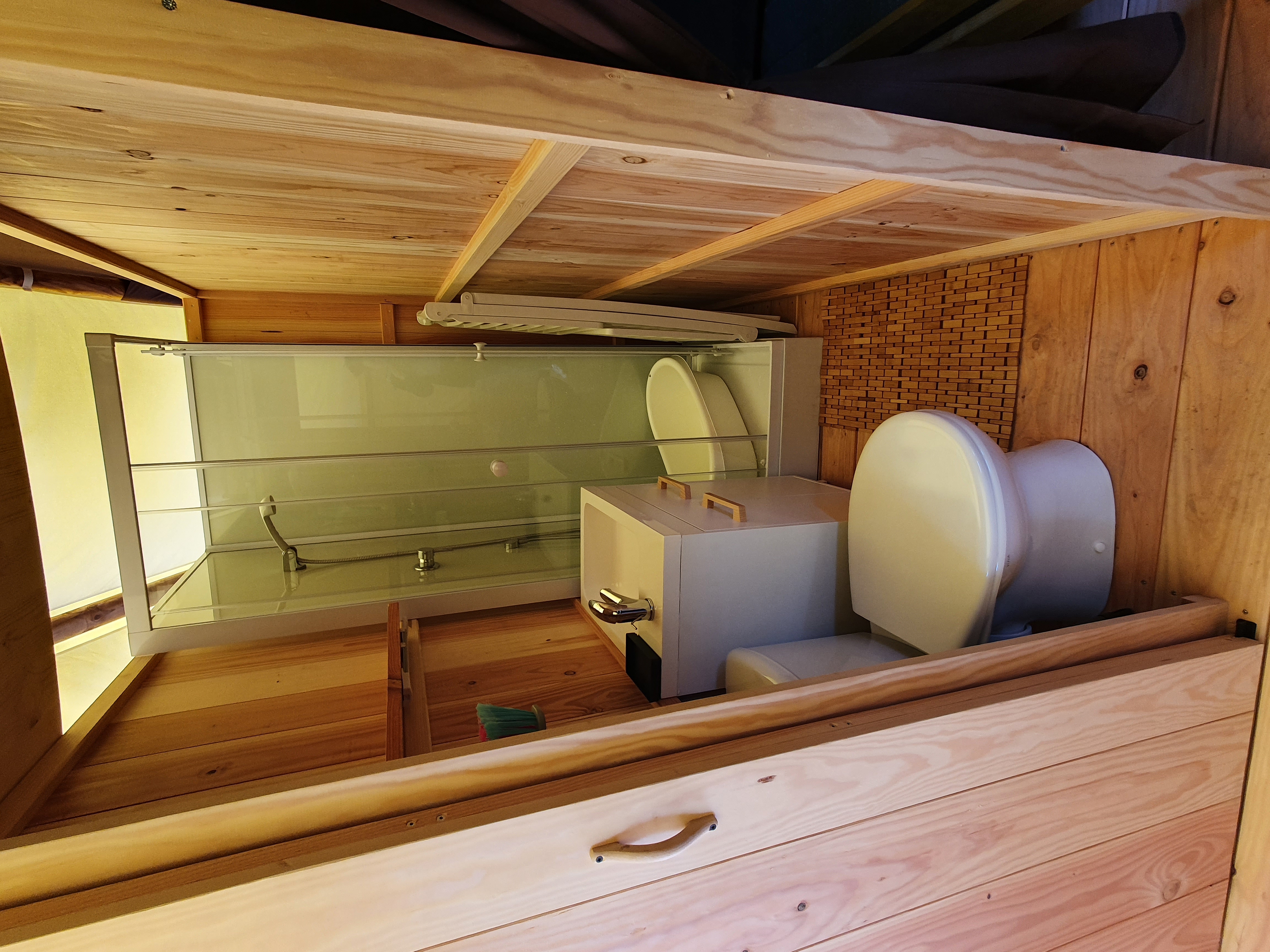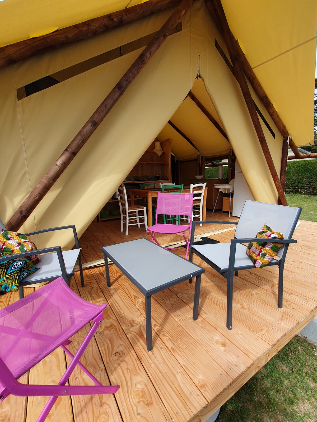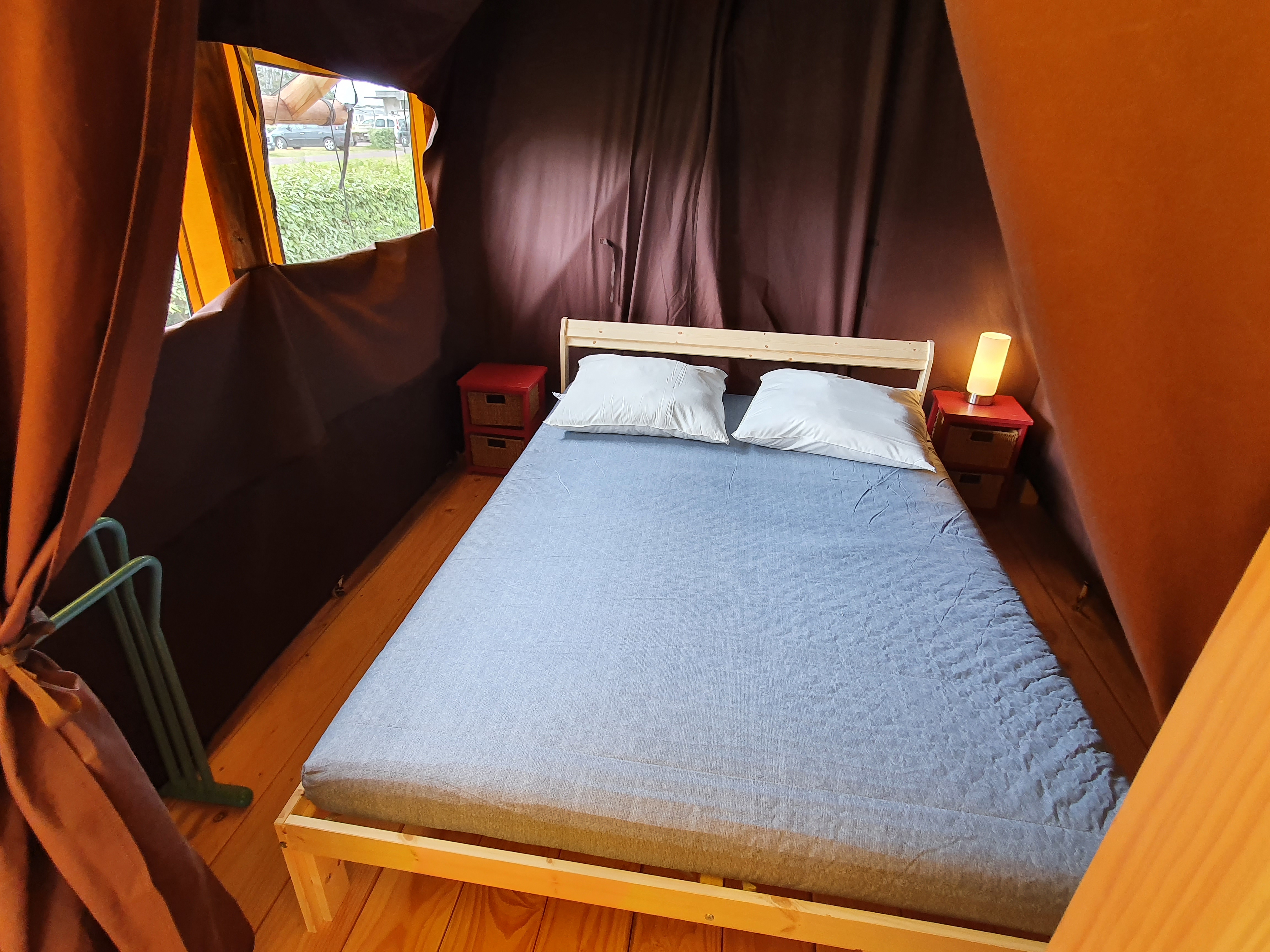 La Lodge Marine est une tente confortable de 29 m², idéale pour un séjour en famille (jusqu'à 6 personnes). Elle est équipée d’une cuisine, d’une chambre avec un lit double, d’une chambre avec 2 lits superposés, ainsi que d'un espace sanitaire privé avec douche et WC.